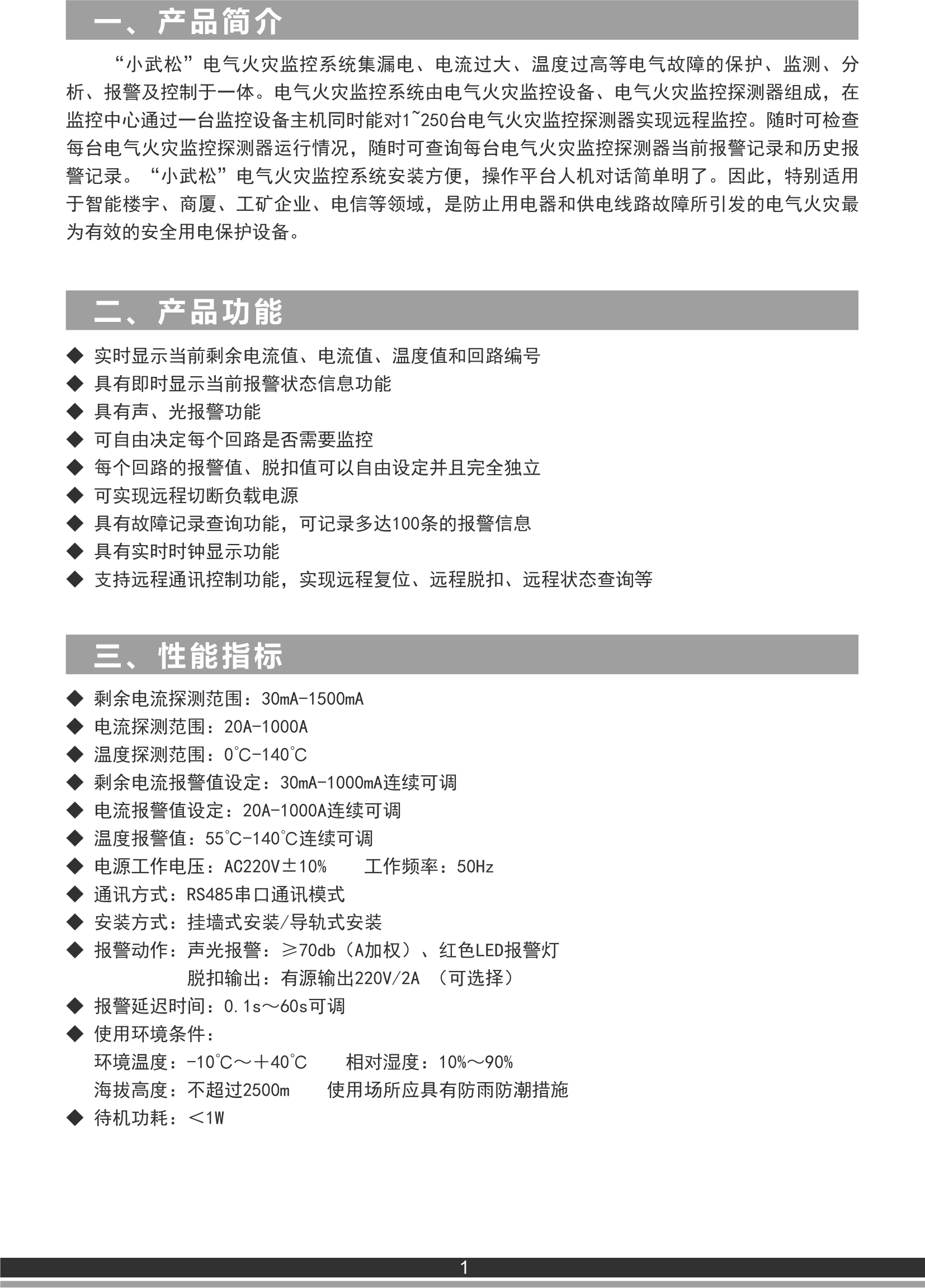 “小武松”电气火灾监控系统集漏电、电流过大、温度过高等电气故障的保护、监测、分析、报警及控制于一体。电气火灾监控系统由电气火灾监控设备、电气火灾监控探测器组成,在监控中心通过一台监控设备主机同时能对1~250台电气火灾监控探测器实现远程监控。随时可检查每台电气火灾监控探测器运行情况,随时可查询每台电气火灾监控探测器当前报警记录和历史报警记录。“小武松”电气火灾监控系统安装方便,操作平台人机对话简单明了。因此,特别适用于智能楼宇、商厦、工矿企业、电信等领域,是防止用电器和供电线路故障所引发的电气火灾最为有效的安全用电保护设备。